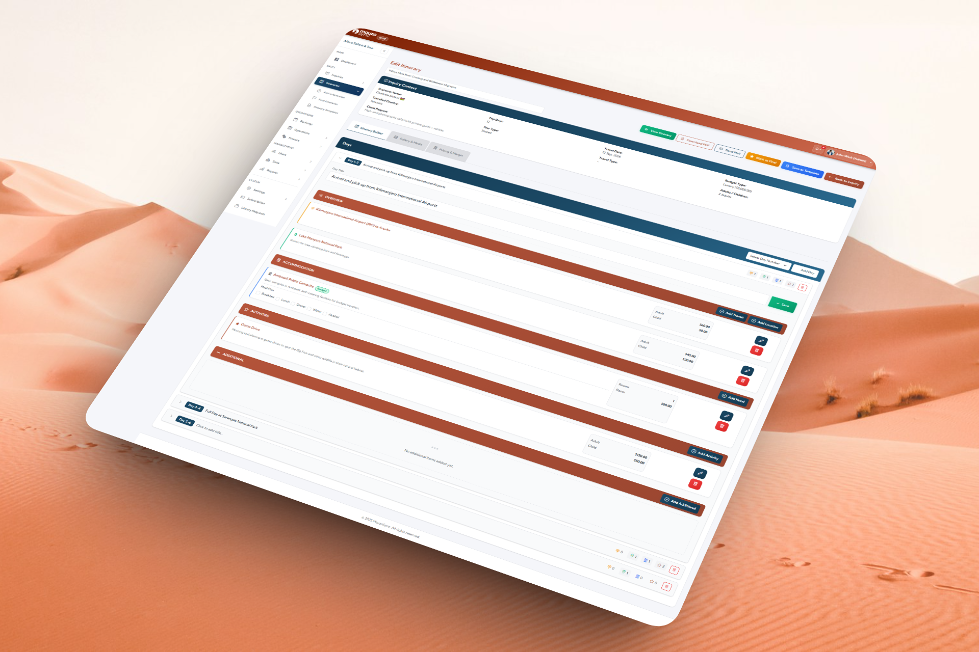 MauzoSync functions as a safari itinerary builder with pricing controls, so proposals stay fast to produce and safe for margin.