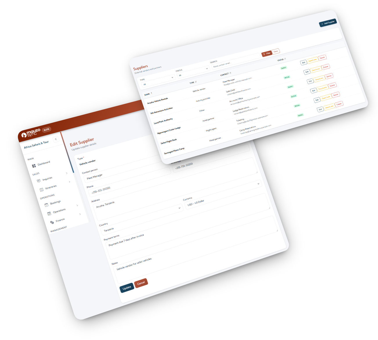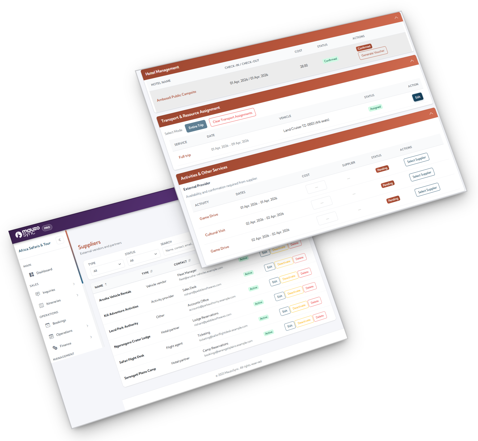 Safari operations depend on strong supplier coordination. MauzoSync maintains a centralized supplier library where all hotels, lodges, activity providers, transport vendors, drivers, and guides are organized properly. Each booking connects directly to this structured database, reducing duplication, errors, and confusion. As your company grows, your supplier network stays clean and controlled.